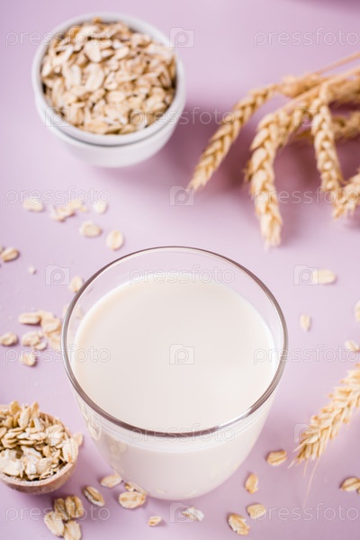 Стакан свежего овсяного молока и овсянки. Веганский безмолочный органический напиток. Вертикальный вид