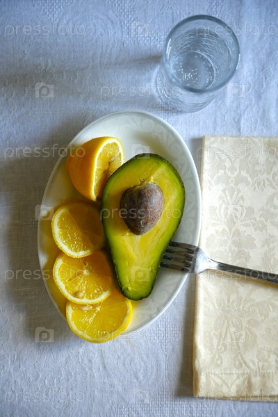 Минеральная вода, лимон, авокадо на столе