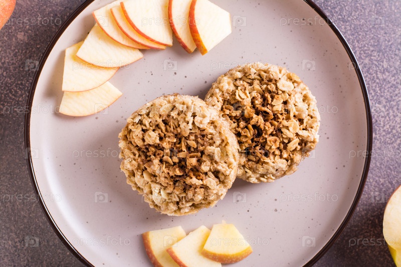 Крупный план яблочных блинчиков и свежих яблок на тарелке. Домашние десерты. Вид сверху