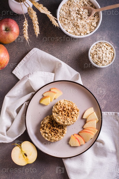 Аппетитная крошка из яблок и овсянки на тарелке и фрукты на столе. Верхний и вертикальный вид