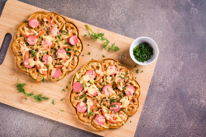 Вафельная пицца с помидорами, сосисками, сыром и зеленью на деревянной доске. Вид сверху