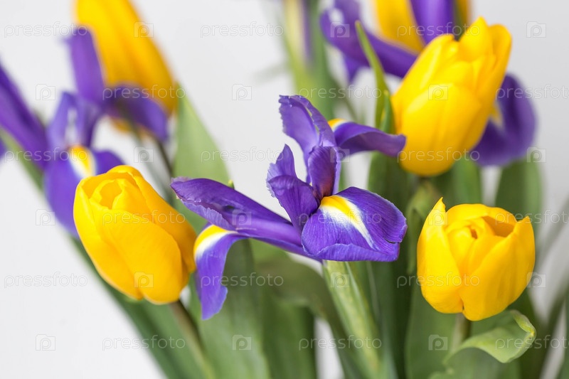 Букет желтых тюльпанов и фиолетовых ирисов на белом изолированном фоне. Концепция наступления весны и Международного женского дня 8 марта