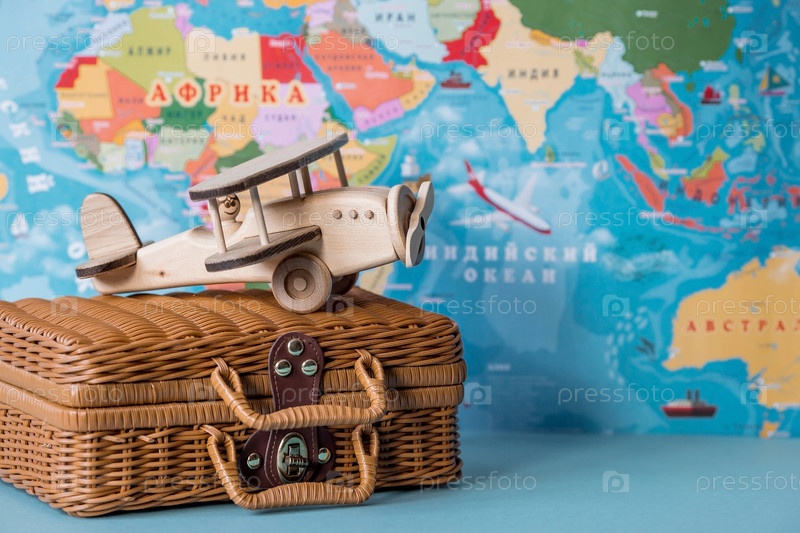 Туризм. Модель винтажного самолета и чемодан на фоне карты мира. Концепция путешествия, приключений и открытий