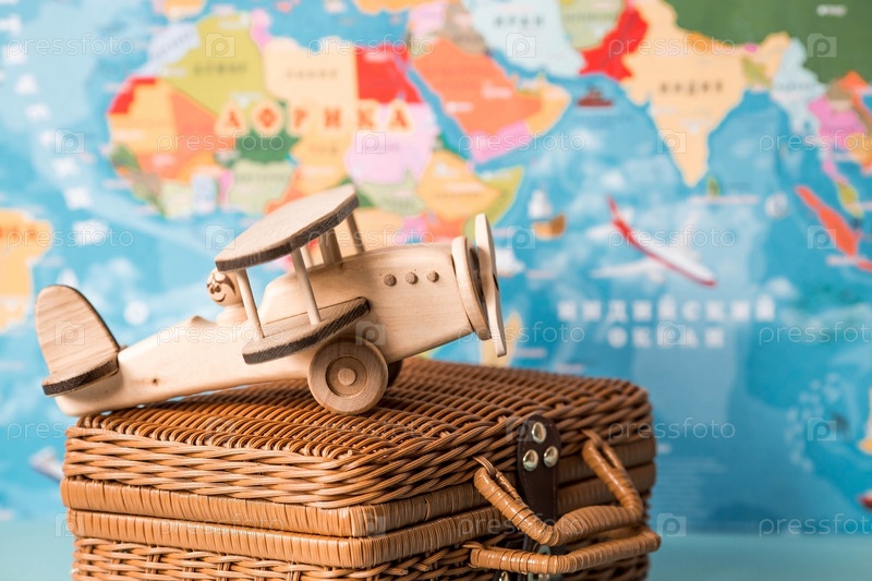 Туризм. Модель винтажного самолета и чемодан на фоне карты мира. Концепция путешествия, приключений и открытий