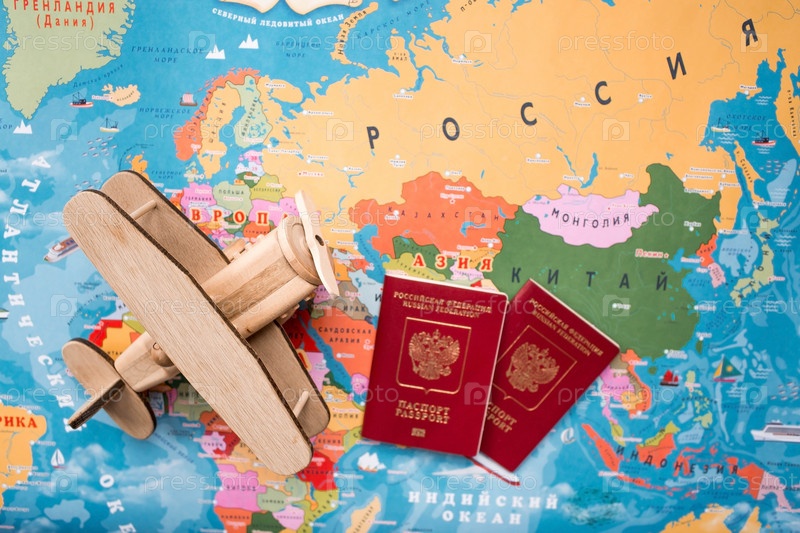 Туризм. Модель винтажного самолета и российский паспорт на фоне карты мира. Концепция путешествия, приключений и открытий