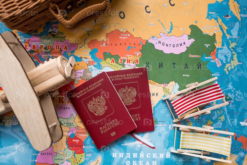 Туризм. Модель винтажного самолета, чемодан и российский паспорт на фоне карты мира. Концепция путешествия, приключений и открытий