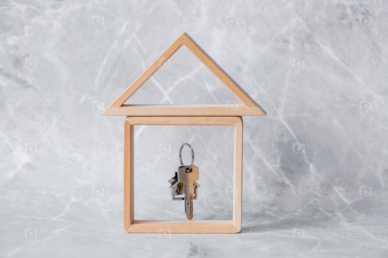 Ипотека. Покупка и аренда жилья. Модель деревянного дома и ключи от новой квартиры на сером фоне. Концепция приобретения жилья
