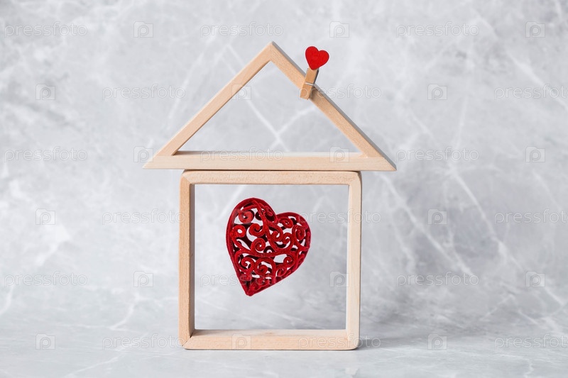 Модель деревянного дома и красное сердце на сером фоне. Концепция дружной счастливой семьи, живущей вместе под одной крышей, любви в доме и Дня святого Валентина