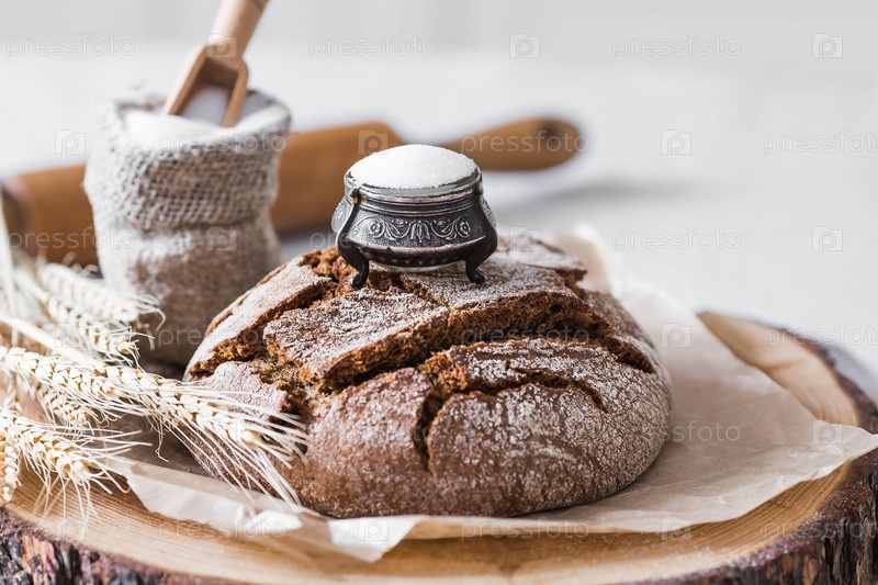 Свежий вкусный хлеб крупным планом и соль. Свежеиспеченный хлеб на закваске с золотой корочкой на деревянной доске. Контекст пекарни с вкусным хлебом. Кондитерские изделия