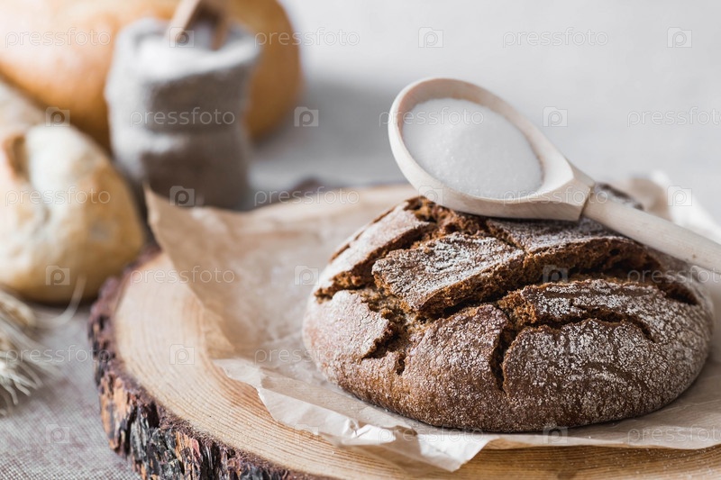 Свежий вкусный хлеб крупным планом и соль. Свежеиспеченный хлеб на закваске с золотой корочкой на деревянной доске. Контекст пекарни с вкусным хлебом. Кондитерские изделия