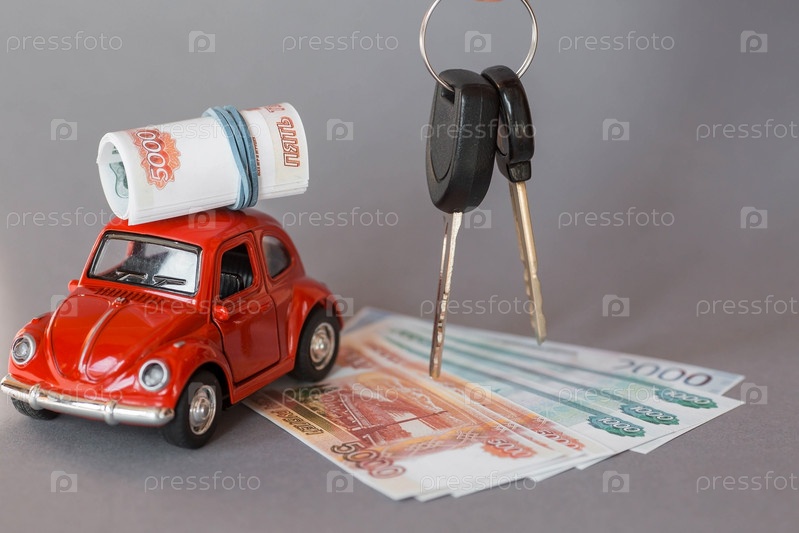 Автокредит. Покупка и аренда автомобиля. Красная машина, деньги и ключи от машины на сером фоне. Концепция покупки и страхования автомобиля