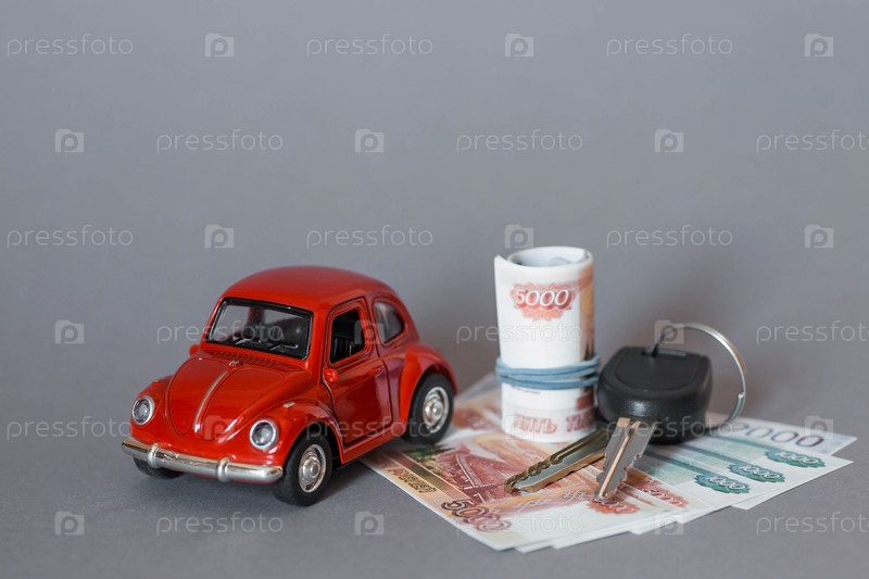 Автокредит. Покупка и аренда автомобиля. Красная машина, деньги и ключи от машины на сером фоне. Концепция покупки и страхования автомобиля