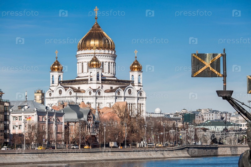 Русский православный собор - собор Христа Спасителя в Москве на фоне голубого неба в солнечный весенний день. Российская Федерация, Москва