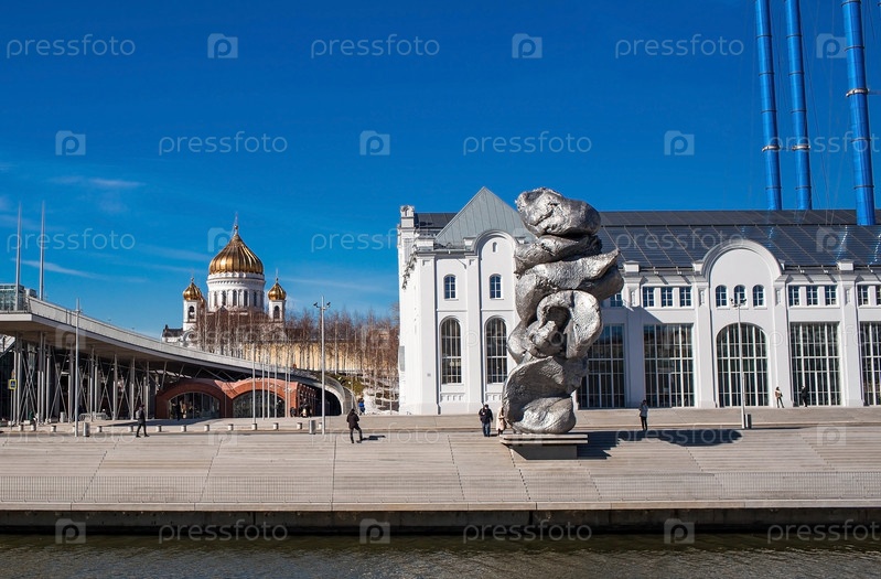 Памятник в Москве на Болотной набережной Урса Фишера «Большая глиняная №4» на фоне Храма Христа Спасителя в ясный весенний день