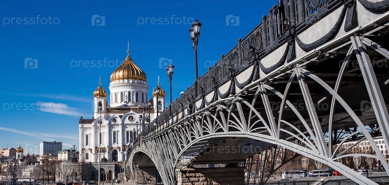 Русский православный собор - собор Христа Спасителя в Москве на фоне голубого неба в солнечный весенний день. Российская Федерация, Москва