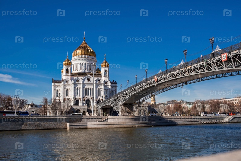 Русский православный собор - собор Христа Спасителя в Москве на фоне голубого неба в солнечный весенний день. Российская Федерация, Москва