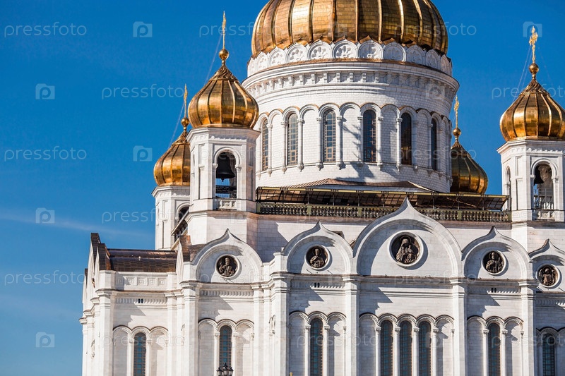 Русский православный собор - собор Христа Спасителя в Москве на фоне голубого неба в солнечный весенний день. Российская Федерация, Москва