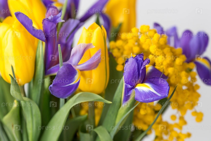 Букет из желтых тюльпанов, мимозы и фиолетовых ирисов на белом изолированном фоне. Концепция наступления весны и Международного женского дня 8 марта