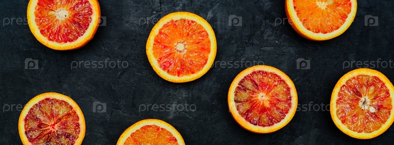 Кровавые апельсины. Половинки кровавых апельсинов разбросаны по черному каменному фону. Баннер