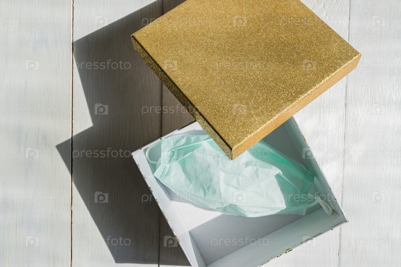 Вид сверху на медицинскую маску в подарочной коробке на белом столе. концепция гигиенического карантина. Плоская планировка, вид сверху