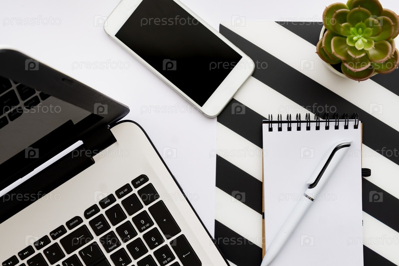 Макет рабочего пространства домашнего офиса с ноутбуком, суккулентом в горшке, блокнотом и аксессуарами. Плоская планировка, вид сверху