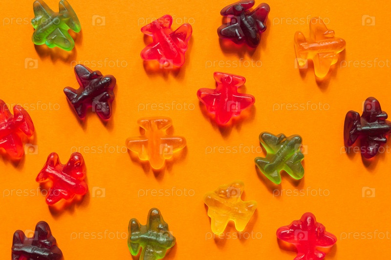 Желейные конфеты, красочные мармеладные самолеты на оранжевом фоне. Открытый узор