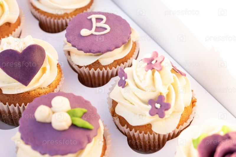 Крупный план вкусных домашних кексов с сахарной глазурью в бумажной коробке