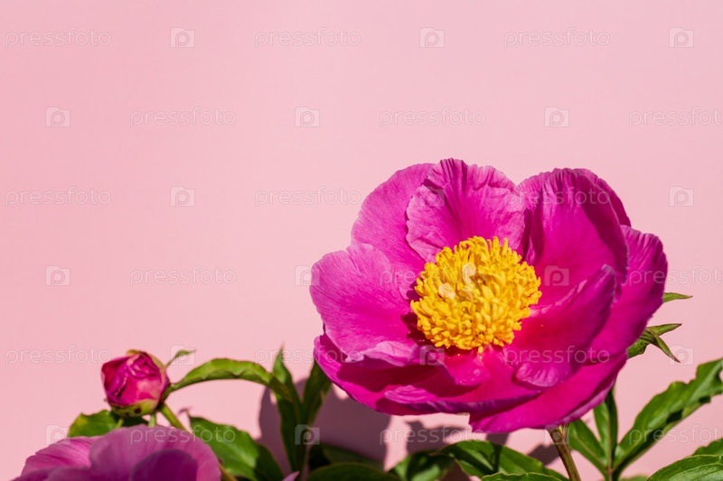 Цветы розового пиона на розовом пастельном фоне. Модный цветочный фон рамки, пространство для копирования, место для текста