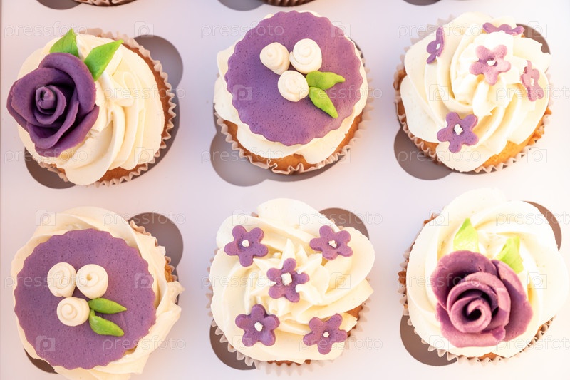 Набор различных вкусных кексов в бумажной коробке для празднования