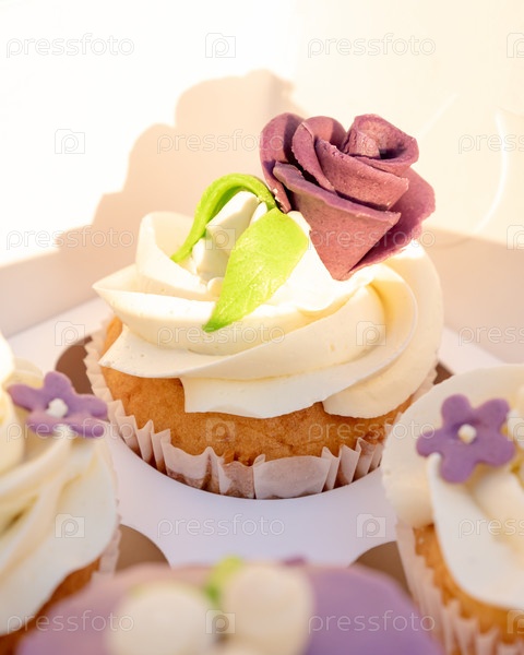 Бумажная коробка с кексами. Праздничные кексы с сахарной розой и масляным кремом. Упаковка кексов, коробка доставки на заднем плане. Подарочная коробка со сладостями