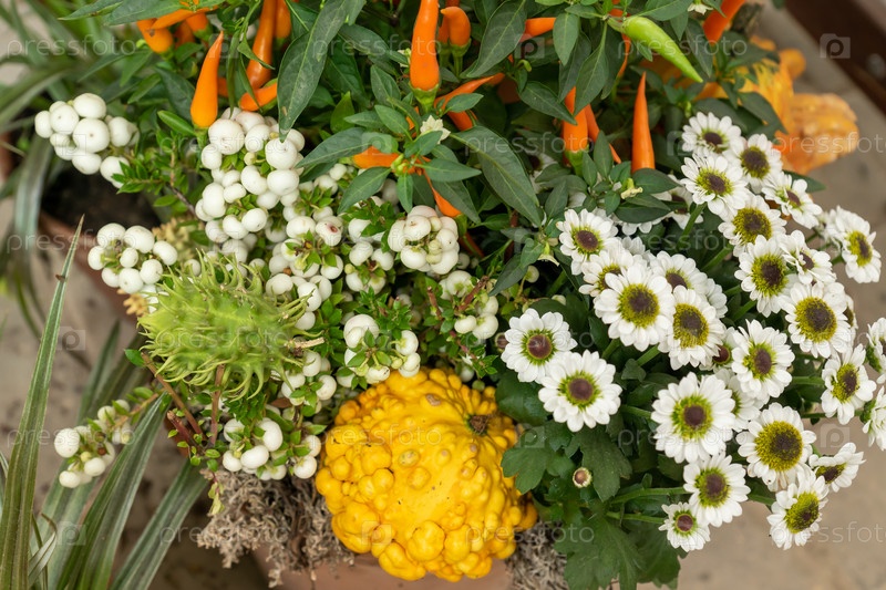 Композиция из осенних цветов. Красивый букет с хризантемами, декоративным перцем и огурцами