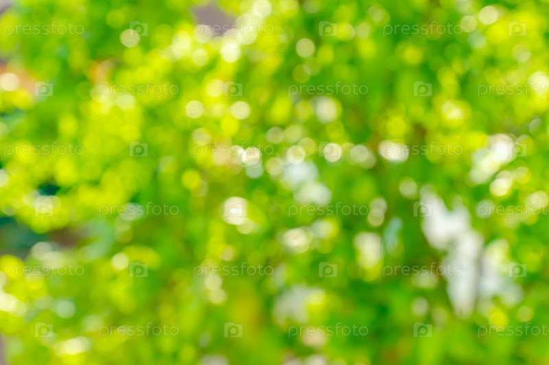 Разноцветный размытый фон боке зеленого дерева в асинных лучах. Расфокусированное изображение