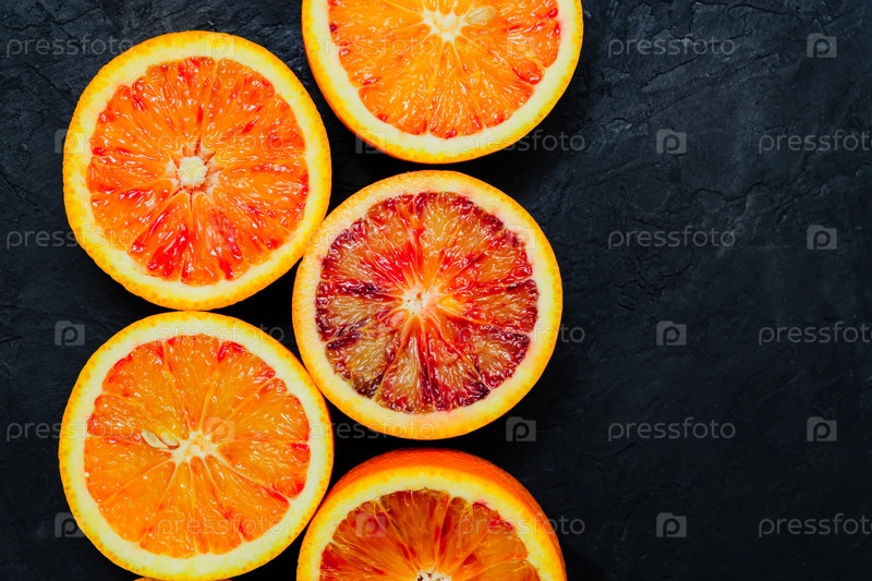 Нарезанные сицилийские кровавые апельсины на черном каменном естественном фоне, вид сверху