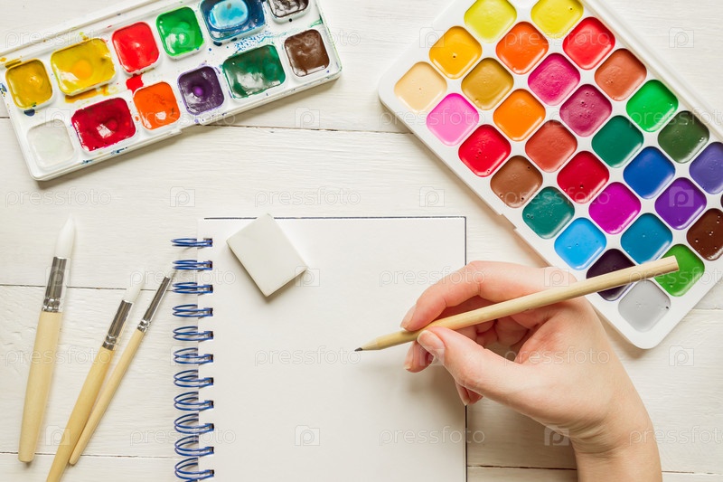 Женская рука рисует эскизы перед акварельной живописью. Акварельные краски и кисти, вид сверху. Креативный художественный макет с копирайтом