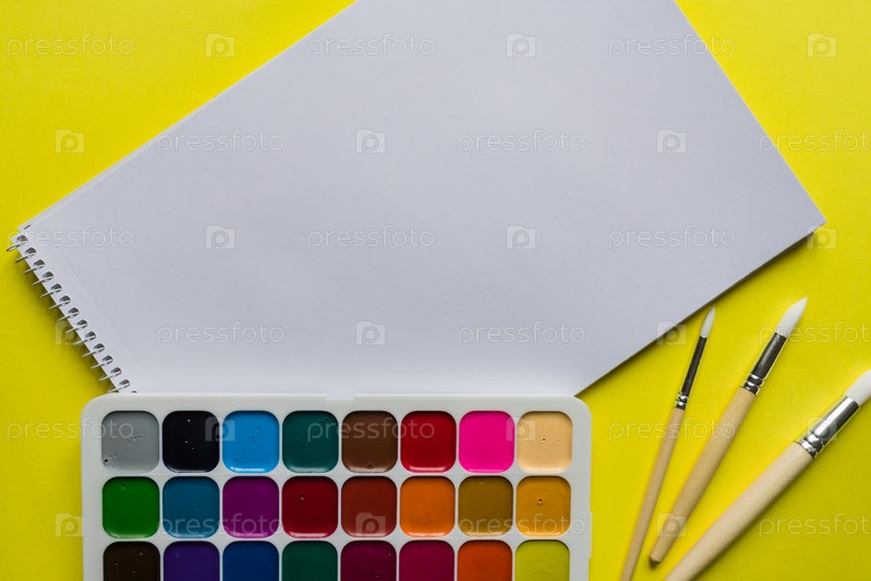 Креативный макет с акварельной палитрой, кистями и альбомом для рисования на желтом фоне. Скопируйте место для текста