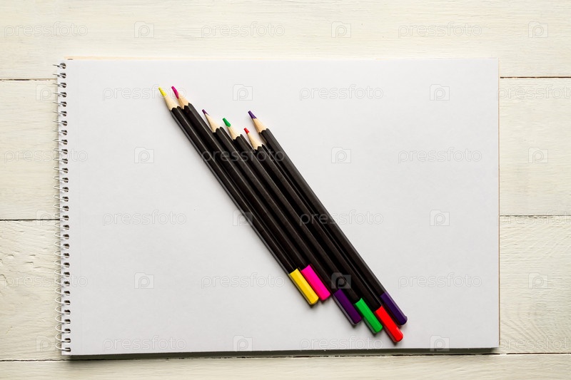 Цветные карандаши на пустой белой альбомной бумаге. Вид сверху. школьные и офисные принадлежности