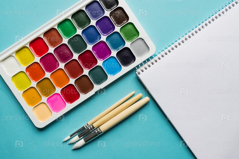 Креативный макет с акварельной палитрой, кисти на синем фоне. Вид сверху. Концепция художников