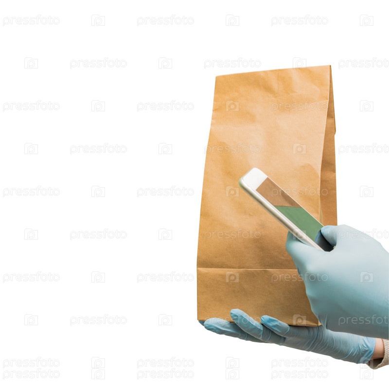 Бесконтактная доставка еды. Женщина-доставщик держит смартфон и бумажную сумку с едой на вынос. Социальное дистанцирование во время пандемии коронавируса