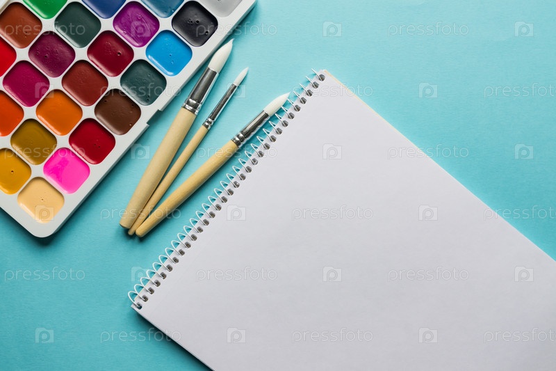Акварельные краски и кисти на синем фоне, вид сверху. Креативный художественный макет с копирайтом. Картина акварелью