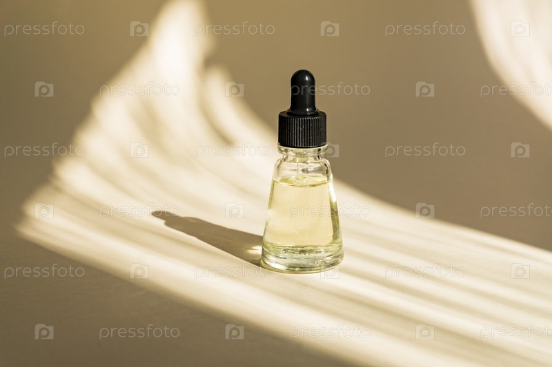 Антивозрастная сыворотка в стеклянной бутылке с капельницей на бежевом фоне. личная жидкость Essential с коллагеном и пептидами