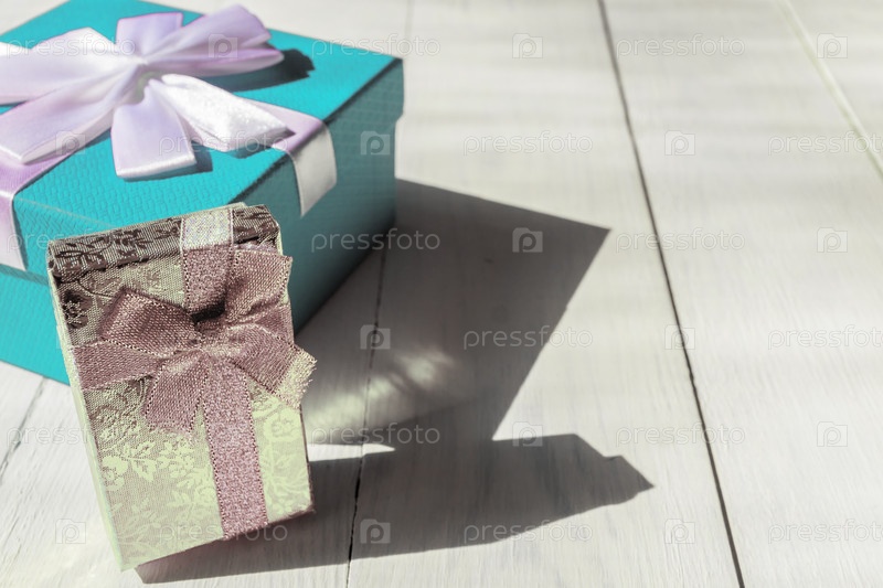 Синие и серебряные подарочные коробки на деревянном фоне. скопируйте место для текста. Праздничная открытка на праздники. Подарки на день рождения