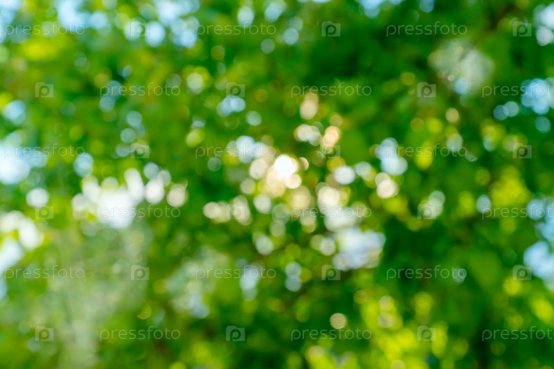 Разноцветный размытый фон боке зеленого дерева в асинных лучах. Расфокусированное изображение