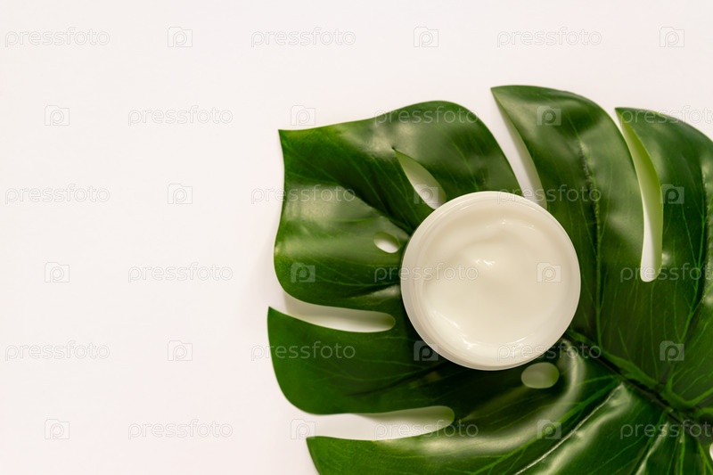 Белая банка крема для лица на фоне завода по производству монстеры или швейцарского сыра. белый фон, вид сверху, плоская планировка. Концепция натуральной косметики