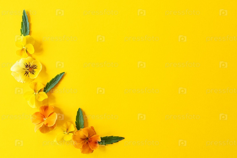 Цветочная композиция кадра. Композиция из цветов анютиных глазок на желтом фоне с копией пространства