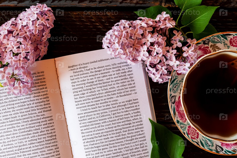 Москва, Россия - 09 июня 2020 г.: Вид сверху на открытую книгу на английском языке и чашку черного чая с сиренью на деревянном столе. Романтический летний фон