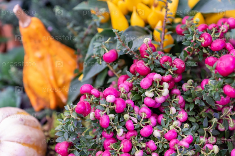 Композиция из осенних цветов. Красивый букет с хризантемами, декоративным перцем и огурцами