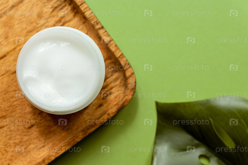 Белая банка крема для лица на деревянном подносе. зеленый фон, вид сверху, тропические листья. Концепция натуральной косметики и спа