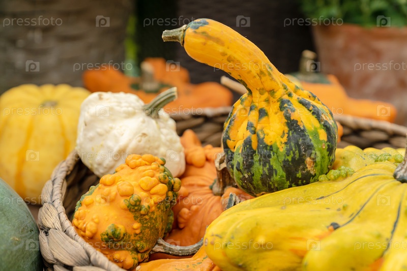 Осенний урожай на фермерском рынке. Декоративные тыквы в корзине крупным планом