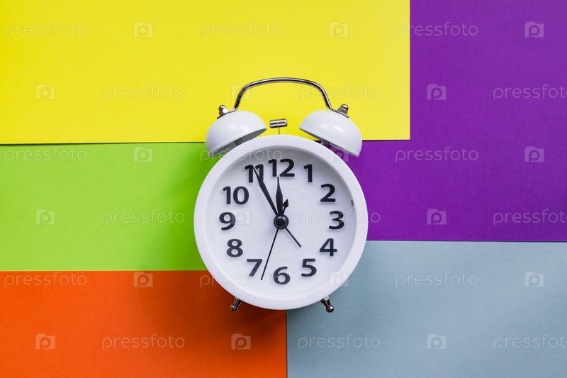 Белый будильник на абстрактном фоне разноцветной бумаги. Минимальная плоская планировка