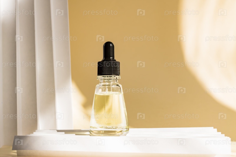 Стеклянная бутылка-капельница с пипеткой. Смоделируйте незаменимую жидкость. На бежевом фоне пастельной бумаги